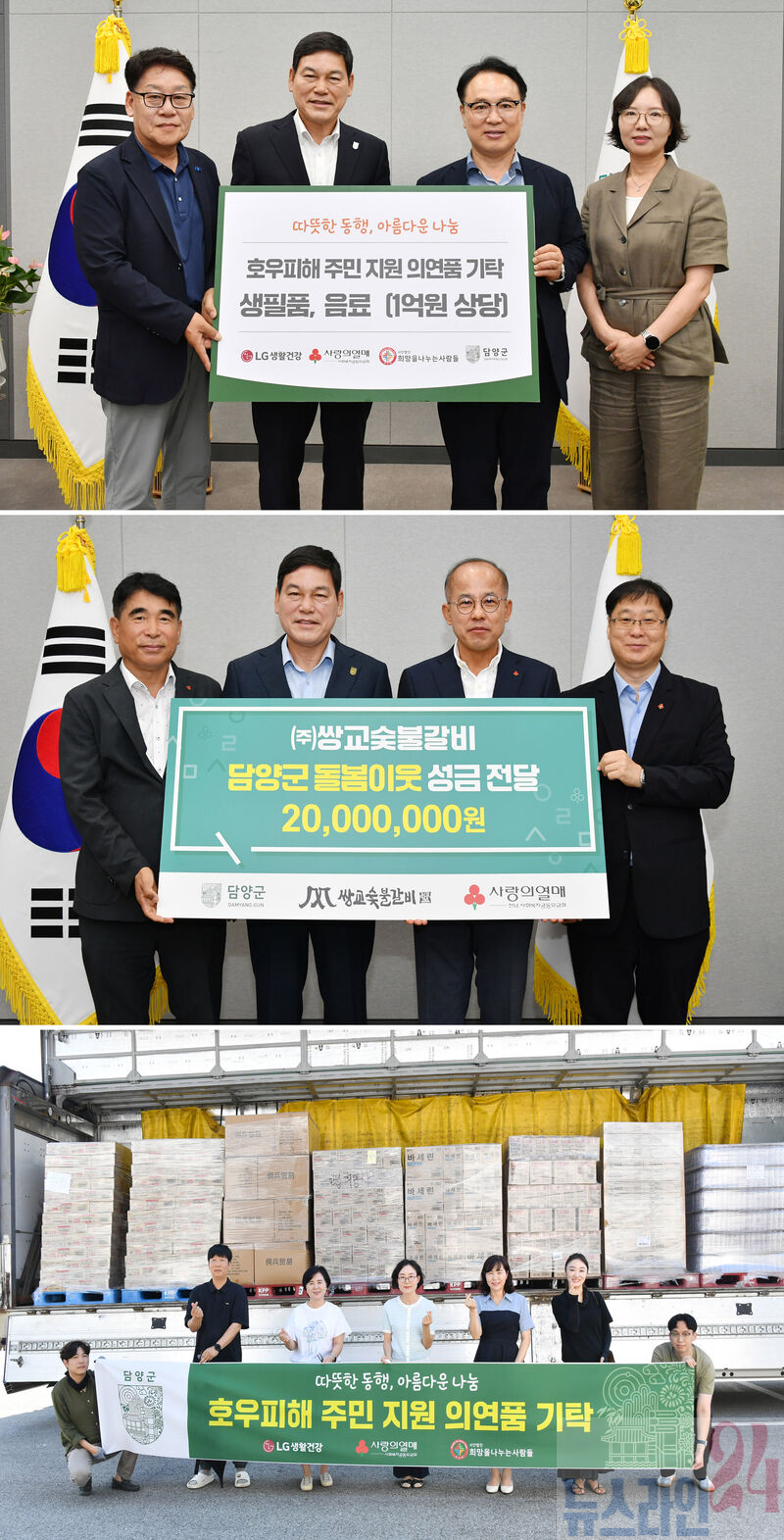 양우회빅마트는 생수·장갑 등 530만 원, SK엠엔서비스 생수 230만 원, 주식회사 오라이트 라텍스 장갑 160만 원, 베비에르 담양점 빵 120만 원, 나라마트식자재 컵라면·햇반 등 40만 원, 현부엌가구실내장식 라면 50만 원 상당 등 지역 기업들의 따뜻한 나눔도 계속됐다.