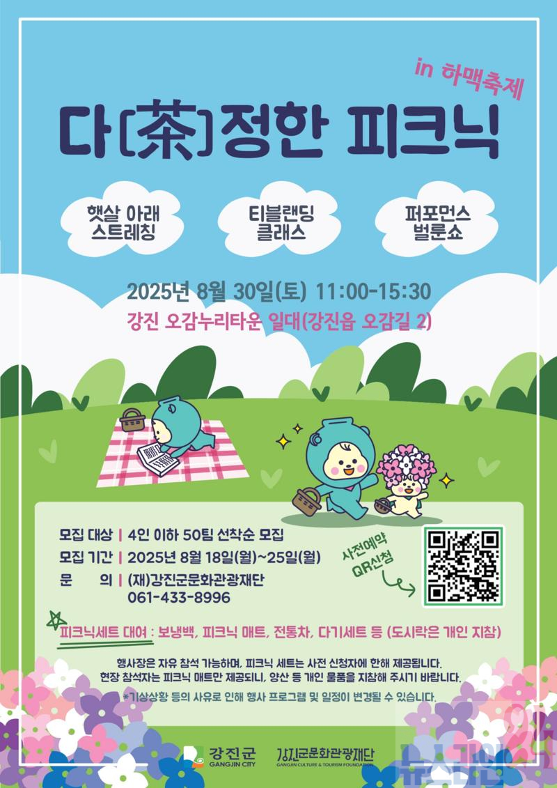 (재)강진군문화관광재단 관계자는 “이번 ‘다(茶)정한 피크닉’은 강진의 차향과 여유 속에서 가족·연인·친구와 함께 특별한 시간을 보낼 수 있는 기회”라며 “하맥축제와 함께 강진만의 감성과 문화를 마음껏 만끽하길 바란다”고 말했다.
