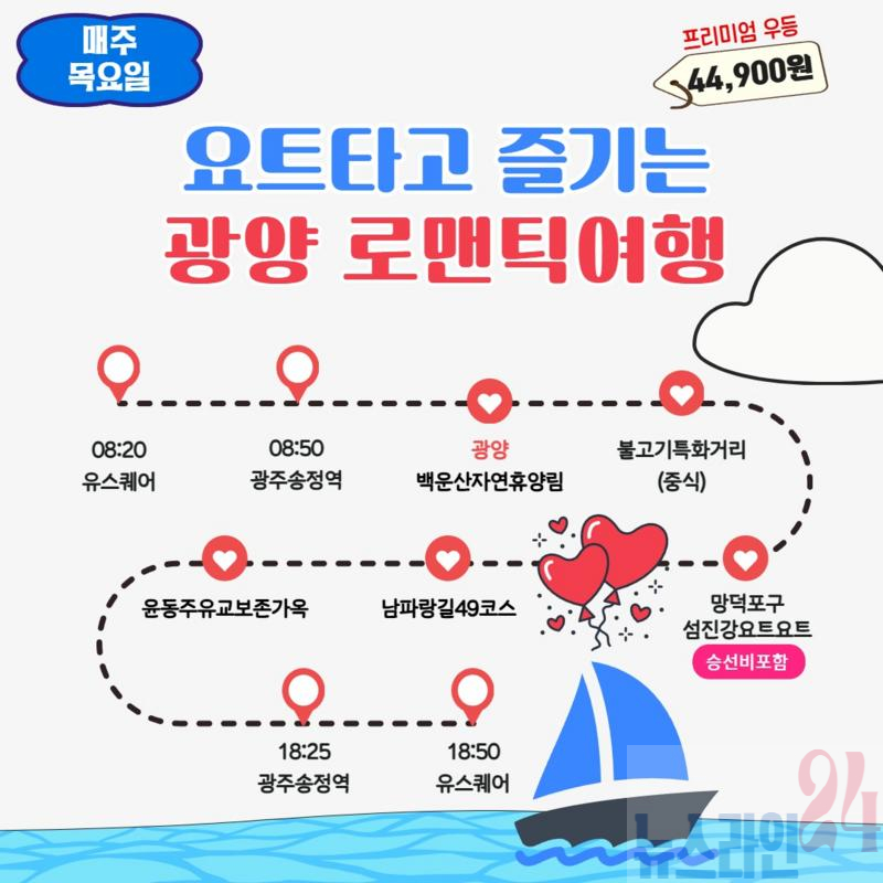 요금은 프리미엄 왕복 버스비와 요트 승선료를 포함해 44,900원(관광지 입장료, 여행자보험, 식비 등 별도)이며 유스퀘어 2번 홈과 송정역 택시승강장에서 탑승할 수 있다. 자세한 안내와 예매는 남도한바퀴 누리집, 콜센터(☎062-360-8502), 카카오톡 채널 등을 통해 확인 가능하다.