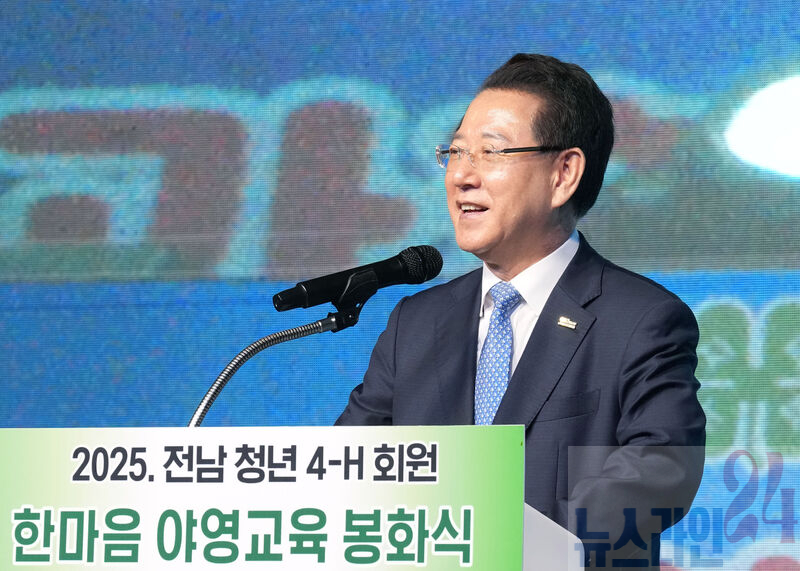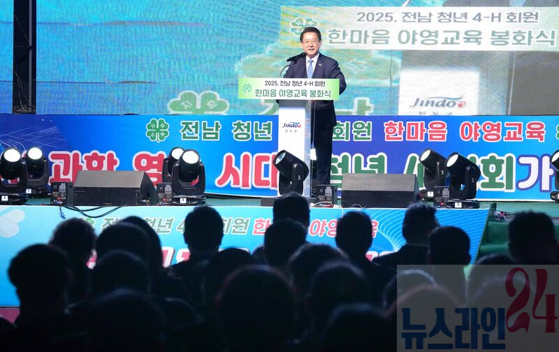 김영록 전라남도지사가 27일 진도 실내체육관에서 열린 ‘2025 전남 청년4-H회원 한마음 야영교육 봉화식’에 참석해 격려사를 하고 있다.