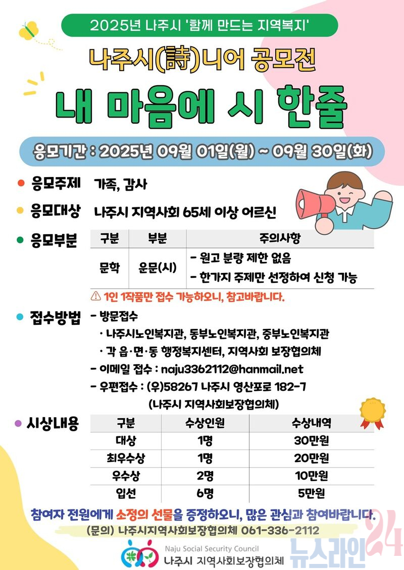 전라남도 나주시지역사회보장협의체 노인 실무분과는 관내 만 65세 이상 어르신을 대상으로 ‘2025년 나주시(詩)니어 제1회 내 마음에 시 한 줄 공모전’을 오는 9월 1일부터 9월 30일까지 개최한다.