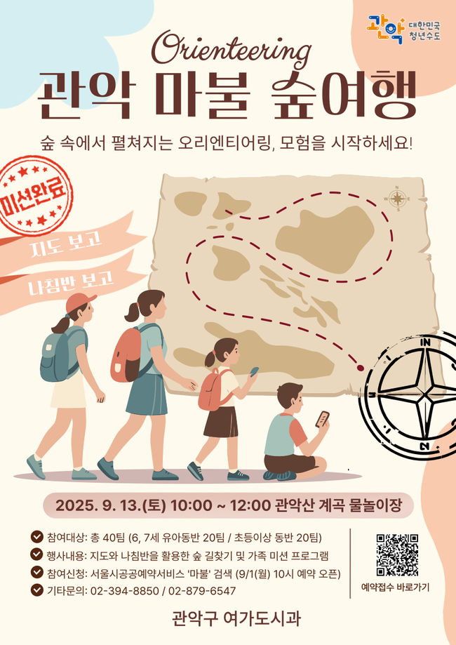 관악구, 가족 숲체험 프로그램 ‘관악 마블 숲여행!’ 운영 숲티어링 결합한 모험·체험형 가족 참여 프로그램 관악산 신림계곡 물놀이장서 9월 13일·27일 진행 집중력·협력심·체력 증진 등 교육·정서 효과 기대