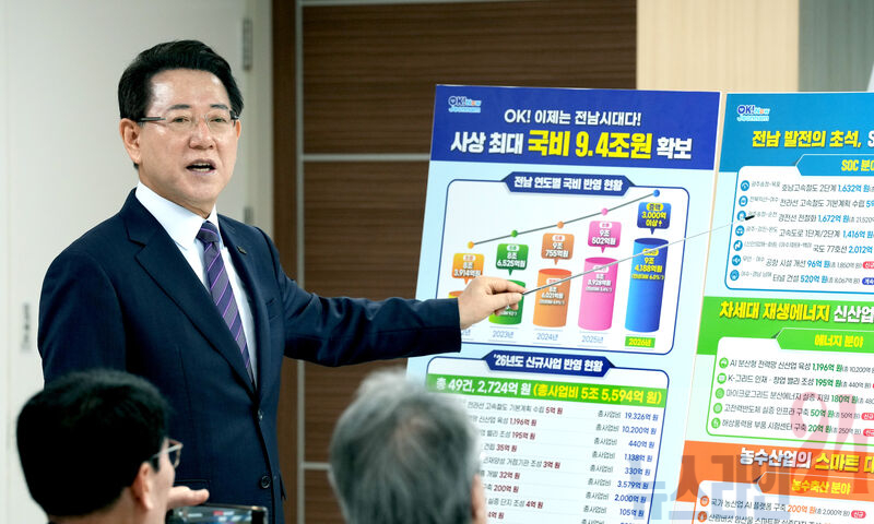 전라남도가 2026년 정부예산안에 9조 4천188억 원을 반영하는 성과를 거뒀다. 이는 지난해보다 5천260억 원(6%) 늘어난 사상 최대 규모로 전남의 현안사업과 미래성장 동력 사업이 대거 포함됐다.
