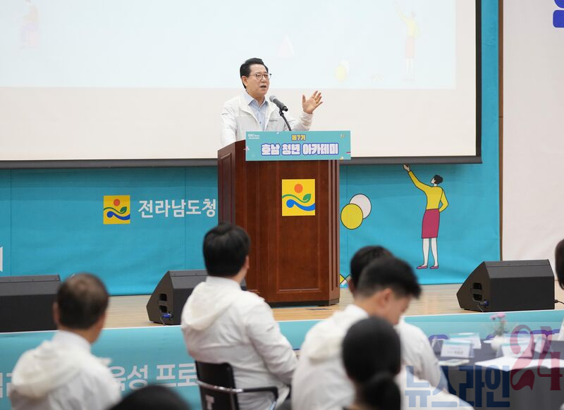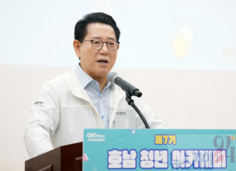김영록 전라남도지사가 30일 전남중소기업일자리경제진흥원에서 열린 ‘제7기 호남 청년 아카데미 개강식’에 참석해 인사말을 하고 있다.