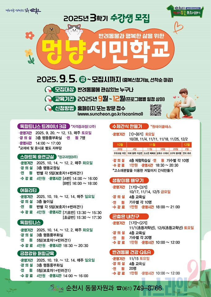 순천시(시장 노관규)는 오는 9월부터 반려동물문화센터(역전길 50, 조곡동)에서 반려동물과 반려인을 위한 교육 프로그램인 ‘멍냥시민학교 3학기’를 운영한다고 밝혔다. 특히 이번 학기에는 반려동물 관련 자격증 과정과 곤충을 주제로 한 어린이 대상 강좌를 신설하여 시민들의 큰 관심이 기대된다.
