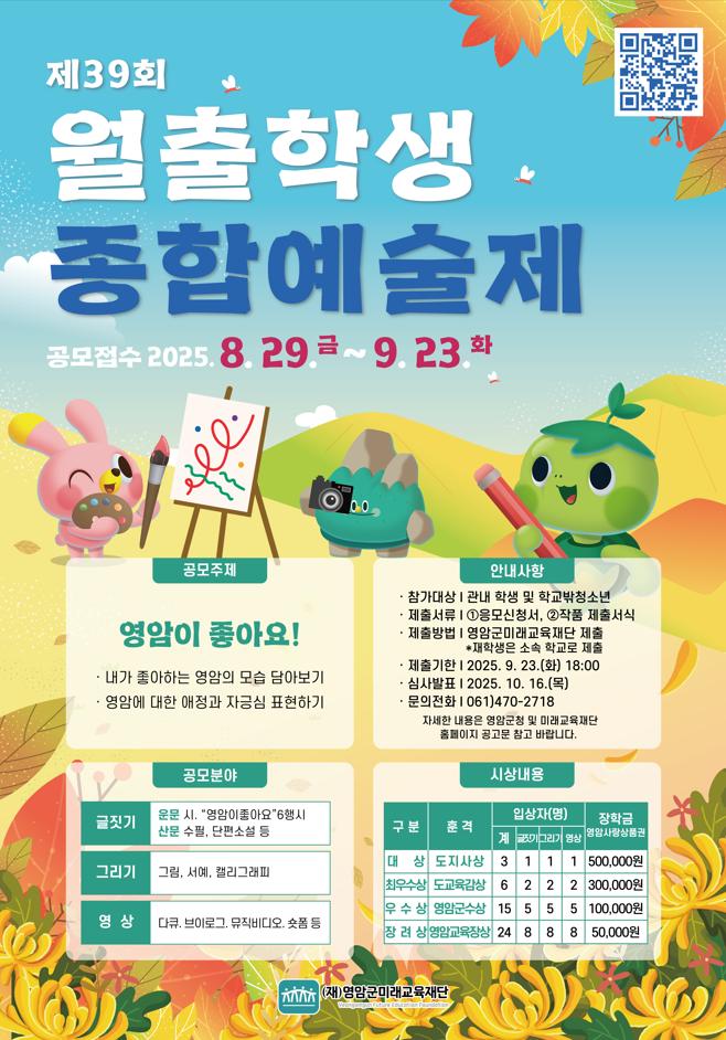 우승희 영암군미래교육재단 이사장은 “월출학생종합예술제를 영암 청소년들의 문화·예술 성취를 나누며 화합하는 장으로 만들겠다. 많은 청소년들의 작품 출품을 기대한다”고 말했다.