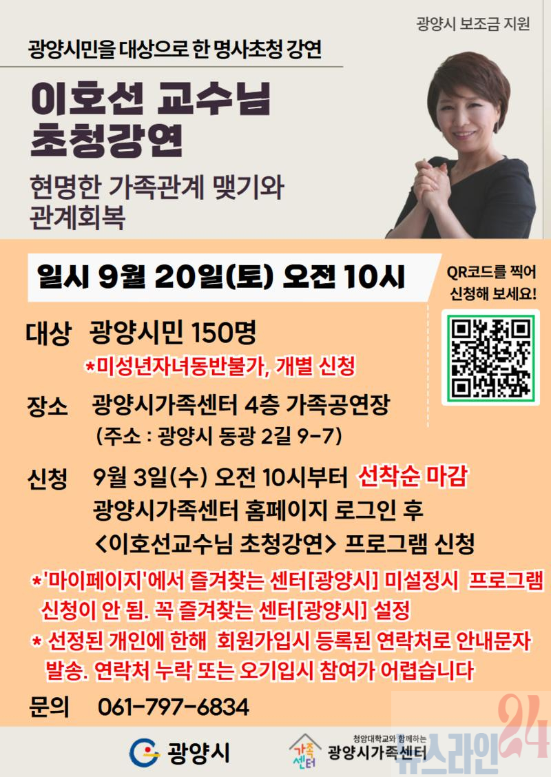 광양시가족센터는 오는 9월 20일 센터 4층 가족공연장에서 광양시민을 대상으로 명사초청 강연을 개최한다고 밝혔다.