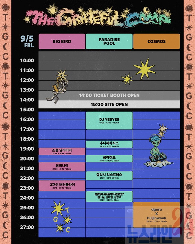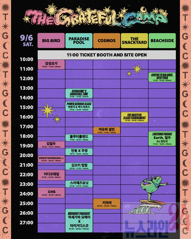 둘째 날 (9월 6일) 오후에는 슈가석율과 플로랄 테크닉스의 ‘쑨콤의 댄스홀타임’, 박문치가 이끄는‘파워 에어로빅 클래스’로 에너지를 끌어올린다. 특히, 무대 한가운데에서 펼쳐지는 이색적인 프로레슬링 매치 ‘THE GRATEFUL CLASH TOURNAMENT’는 현장을 뜨겁게 달굴 예정이다.
