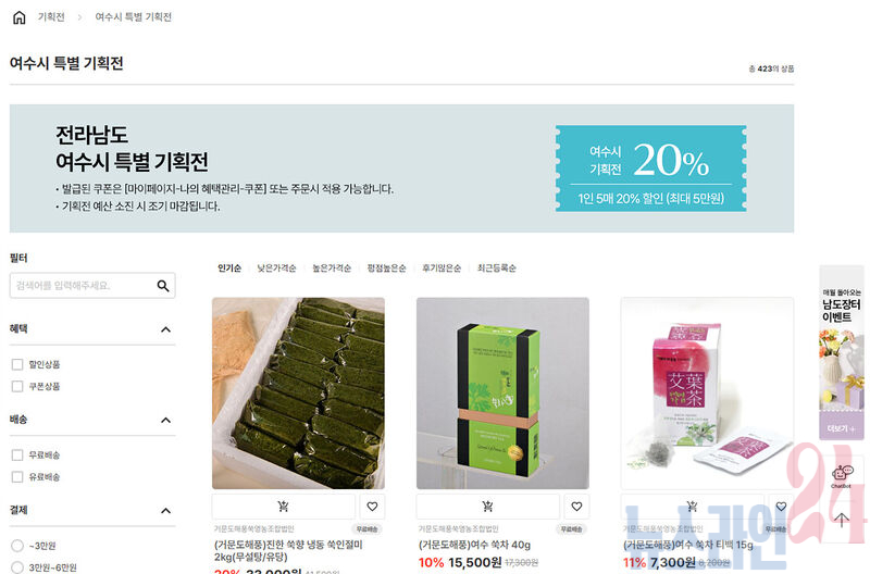 소비자는 남도장터 누리집(https://www.jnmall.kr) 내 ‘여수시 특별 기획전 전용관’을 통해 다양한 상품을 편리하게 둘러보고 할인 혜택을 누릴 수 있다.