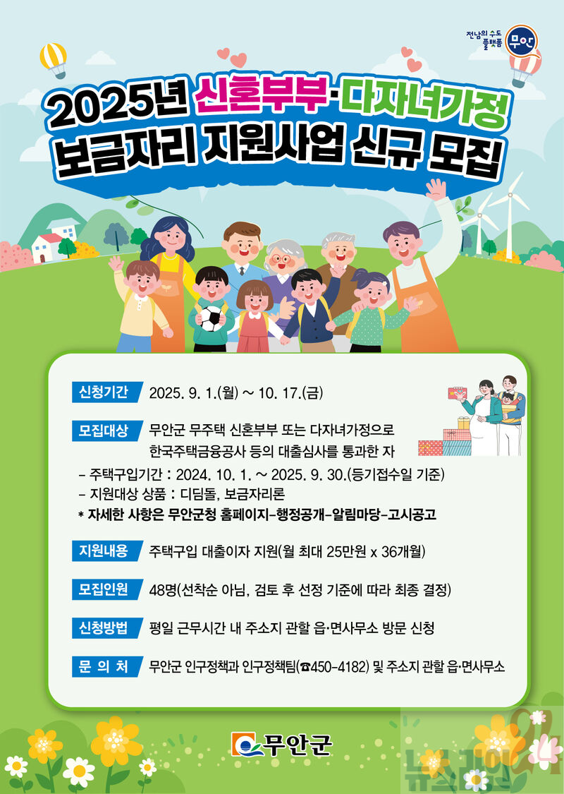 무안군(군수 김산)은 가정의 안정적인 주거환경 조성을 위해 신혼부부와 다자녀가정을 대상으로 9월 1일부터 10월 17일까지 ‘보금자리 지원사업’ 대상자를 모집한다고 밝혔다.