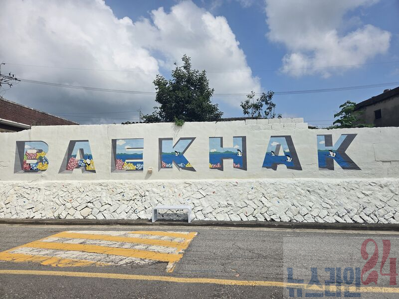 백학마을 주민들은 간척 이전 바닷물이 들어와 학이 노닐던 아름다운 마을 모습을 떠올리며 마을 경로당 앞의 노후 벽면에 ‘BAEKHAK’이라는 마을 이름을 담은 벽화 포토존을 만들었다.