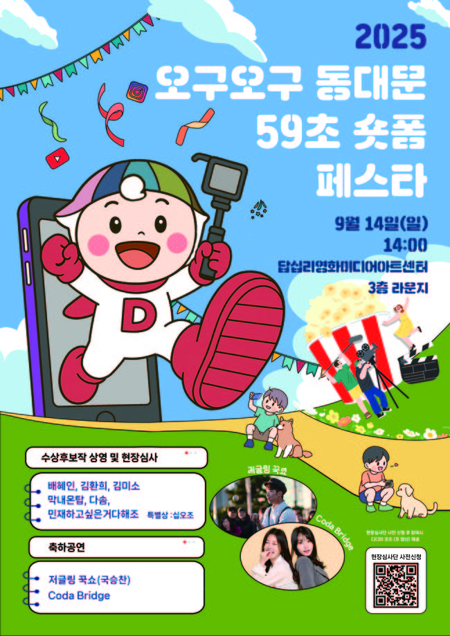 서울 동대문구가 구민과 방문객이 직접 발굴한 지역 명소를 주제로 한 ‘59초 숏폼 공모전’ 수상작을 공개하고, 오는 14일 답십리영화미디어아트센터에서 ‘오구오구 동대문 59초 숏폼 페스타’를 개최한다.