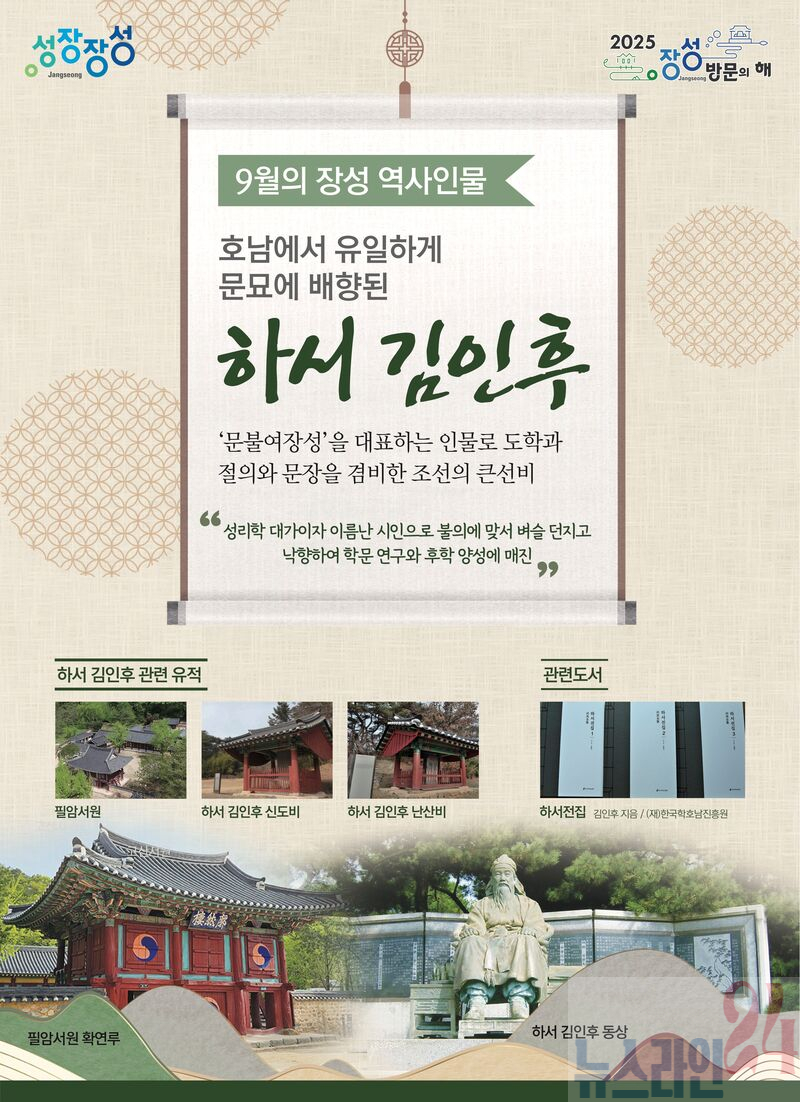 김한종 장성군수는 “충의를 중시 여긴 하서 선생의 가르침은 오늘날 우리들에게 큰 울림을 전한다”며 “9월의 장성 역사 인물로 선정해 선생을 기리고, 가치 있는 삶에 대해 함께 생각해 보는 시간을 갖고자 한다”고 말했다.