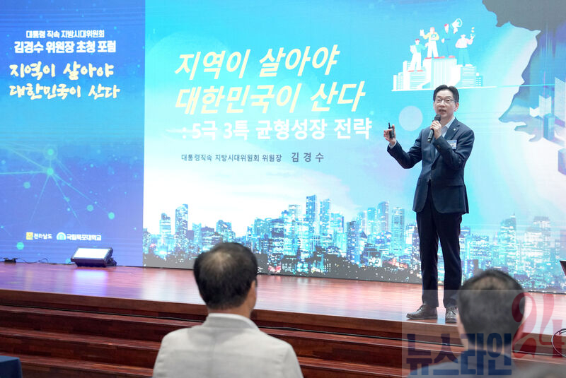 김경수 지방시대위원장이 9일 오후 국립목포대 글로컬스타트업센터에서 ‘지역이 살아야 대한민국이 산다’란 주제로 특별강연을 하고 있다.