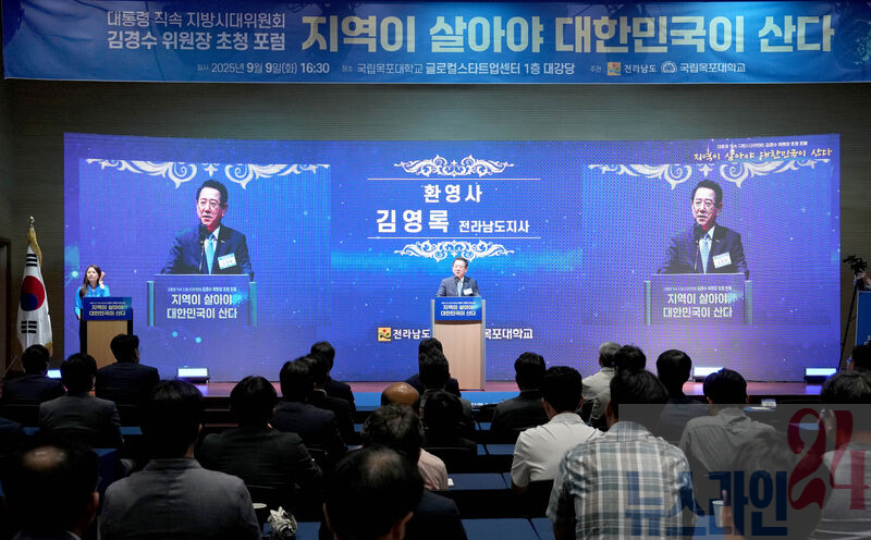 김영록 전라남도지사가 9일 오후 국립목포대 글로컬스타트업센터에서 열린 김경수 지방시대위원장 초청 포럼에서 인사말을 하고 있다.