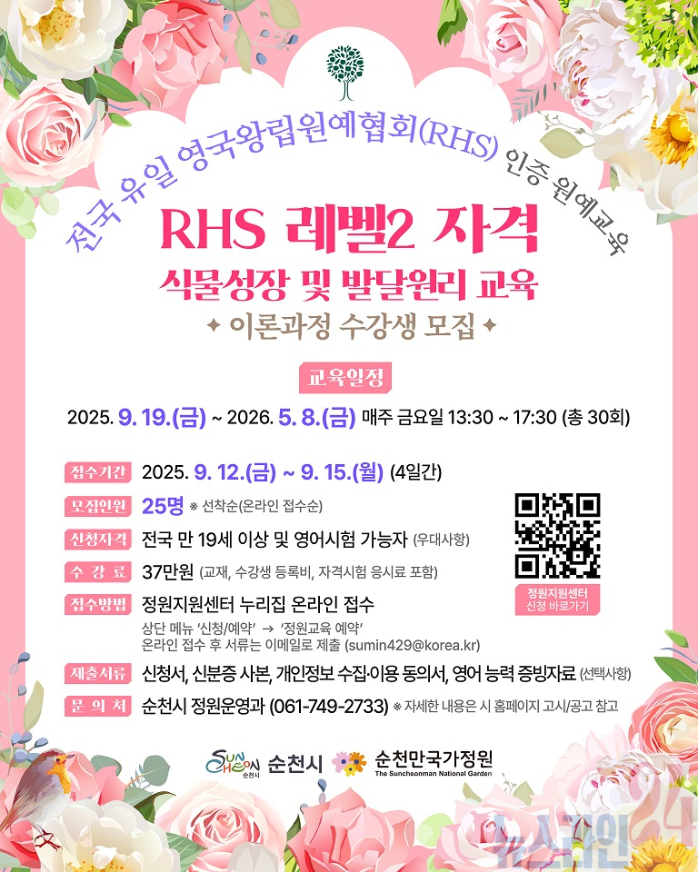 순천시(시장 노관규)는 정원원예와 식물학 분야에서 세계적으로 권위를 인정받는 영국왕립원예협회(이하 RHS)의 ‘RHS 레벨2 자격 식물성장 및 발달원리 교육(RHS Level 2 Certificate in the Principles of Plant Growth and Development)’ 이론 과정 수강생을 모집한다고 밝혔다.