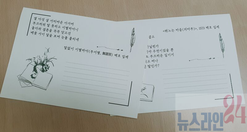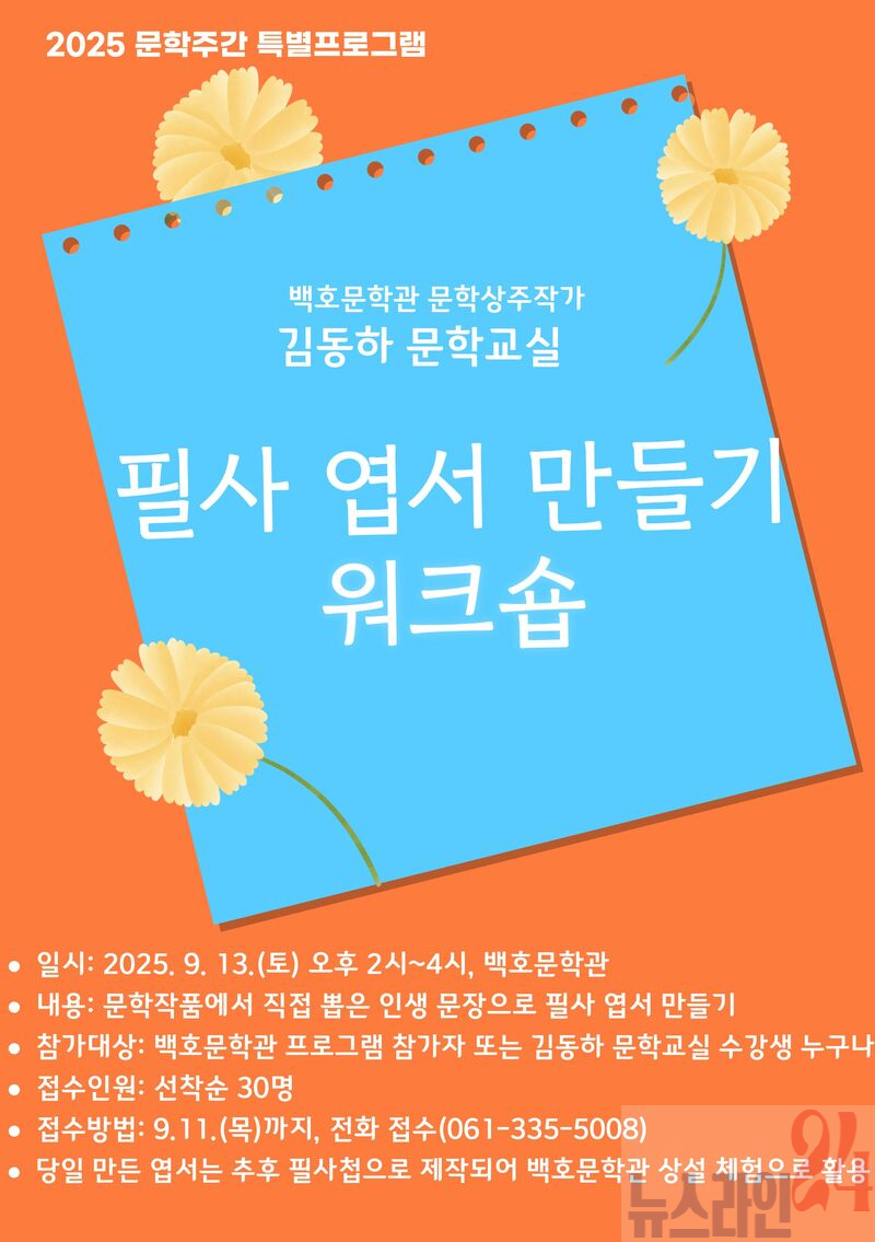 필사 엽서 만들기는 9월 13일 오후 2시에 백호문학관 1층 문화나눔실에서 열린다.
