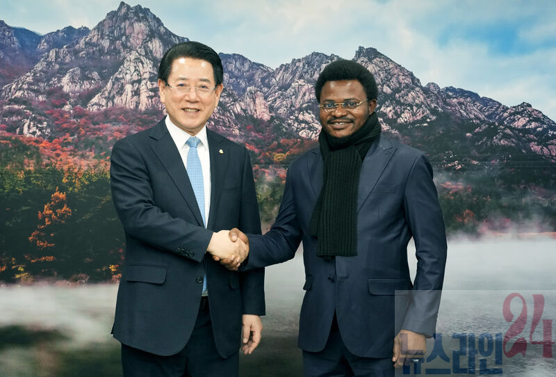 김영록 전라남도지사가 23일 도청 접견실에서 콩고민주공화국 렌돈콜리아 레바봉가 폴랭 초포주지사와 인사를 나누고 있다.