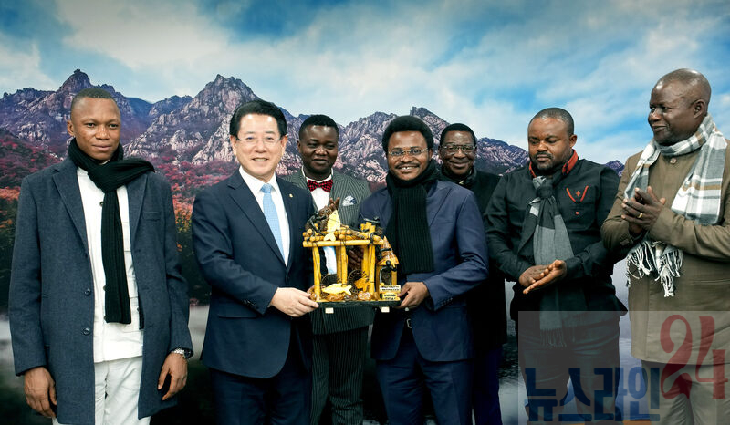 김영록 전라남도지사가 23일 도청 접견실에서 콩고민주공화국 렌돈콜리아 레바봉가 폴랭 초포주지사와 기념품을 교환하고 기념촬영을 하고 있다.