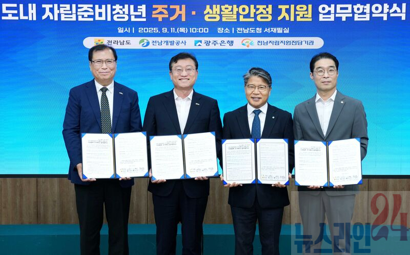전라남도는 전남개발공사, 광주은행, 전남자립지원전담기관과 11일 도청 서재필실에서 지역 자립준비청년의 주거와 생활 안정을 위한 전국 최초의 통합 주거복지 업무협약을 했다고 밝혔다.