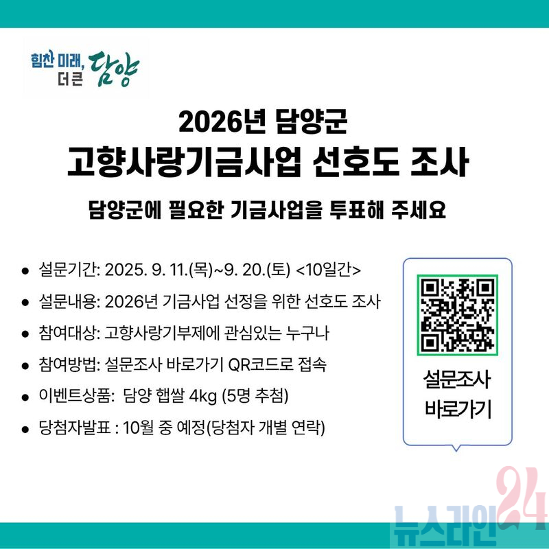 담양군(군수 정철원)은 2026년 고향사랑기금사업 선정에 기부자와 군민의 의견을 반영하기 위해 11일부터 20일까지 10일간 ‘담양군 고향사랑기금사업 선호도조사’를 진행한다.이번 조사는 기금 운용의 투명성을 확보하고 기부 취지에 맞는 사업을 선정하기 위한 절차로, 대국민 공모와 부서 제안을 통해 접수된 아이디어를 바탕으로 소관 부서의 실무 협의를 거쳐 선정된 총 4건의 후보 사업을 대상으로 한다.