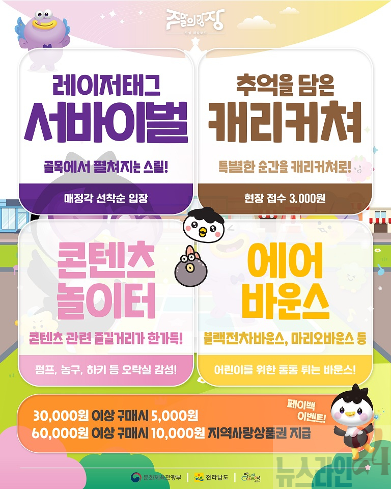주말의 광장 트레이드마크는 단연 ‘잔디로드’로, 평범한 연향동 거리를 싱그러운 초록빛 휴식 공간으로 탈바꿈한다. 여기에 순천시 대표 캐릭터 루미의 10M 대형 조형물과 포토존이 더해져, SNS 핫플레이스가 탄생할 것으로 기대된다.
