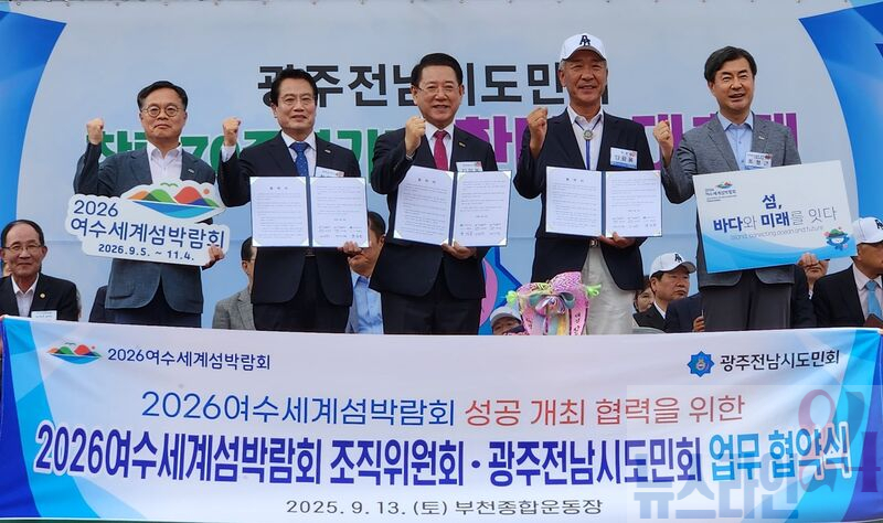 (재)2026여수세계섬박람회조직위원회(이하 ‘조직위’)와 광주전남시도민회(양광용 회장)는 지난 13일 부천 종합운동장에서 개최한 ‘광주전남시도민회 창립 70주년 기념 한마음 대축제’에서 2026여수세계섬박람회 성공 개최와 고향 발전을 위한 업무협약을 체결했다.