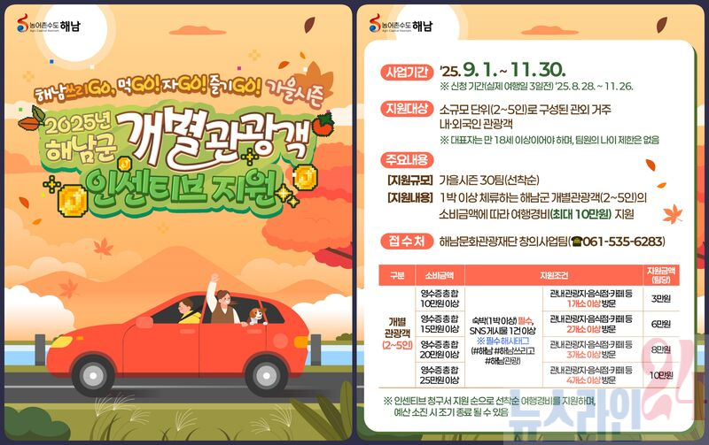 (재)해남문화관광재단은 체류형 관광객을 대상으로 한 인센티브 지원사업‘해남쓰리Go – 먹Go! 자Go! 즐기Go!’가을 프로그램을 9월부터 운영하고 있다.