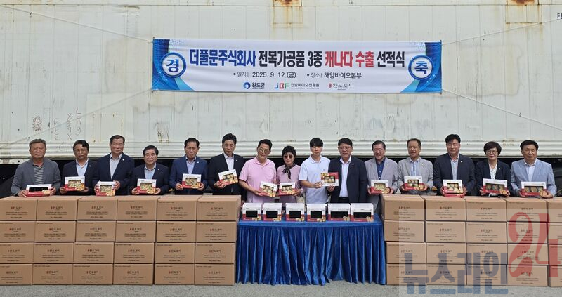 완도군은 지난 12일 완도해양바이오본부에서 박지원 국회의원과 이철 전라남도의회 부의장, 김양훈 군의회 의장 및 군의원, 박희연 해양바이오본부장, 유장영 더풀문주식회사 대표 등이 참석한 가운데 캐나다 수출 선적식을 진행했다.