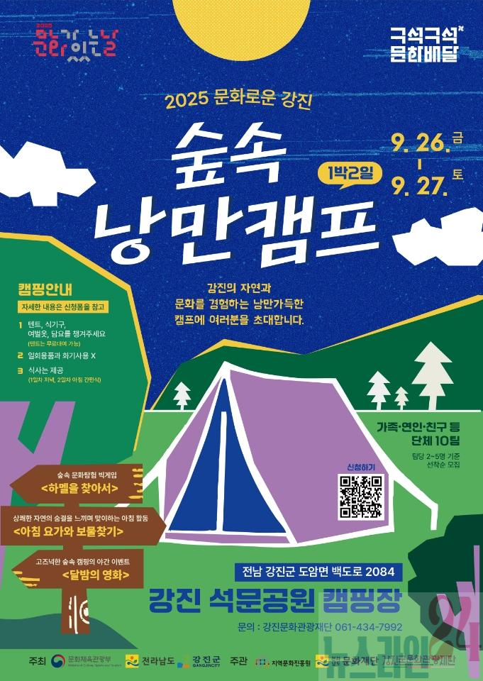 강진군이 ‘2025 문화가 있는 날–구석구석 문화배달’ 사업의 하나로 ‘캠핑과 함께하는 문화로운 강진’을 오는 26일부터 27일까지 석문공원과 10월 31일부터 11월 1일까지 하멜 감성텐트촌에서 두 차례 진행한다.