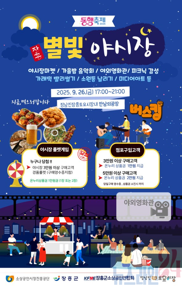 장흥군은 정남진장흥토요시장 만남의광장에서 9월 26일 오후 5시부터 오후 9시까지 소상공인진흥공단과 장흥군소상공인연합회 주관으로 ‘별빛야시장’을 개장한다고 밝혔다.