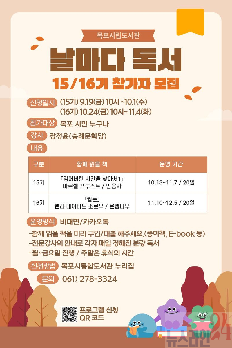 참가 신청은 목포시 통합도서관 누리집에서 가능하며, 15기는 9월 19일 오전 10시부터, 16기는 10월 24일부터 접수 예정이다. 프로그램 관련 자세한 문의는 목포시립도서관(061-278-3324)으로 하면 된다.