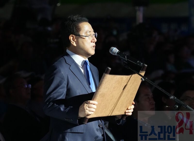 김영록 전라남도지사가 19일 해남 우수영관광지에서 열린 ‘2025 명량대첩축제 개막식’에 참석, 승전 장계를 낭독하고 있다.
