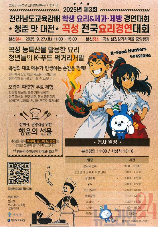 곡성군(군수 조상래)은 K-Food 먹거리 개발과 미래인재 육성을 위해 오는 27일(토) 곡성 섬진강기차마을 중앙광장에서 ‘2025년 제3회 곡성전국요리경연대회’를 개최한다고 19일 밝혔다. 이번 대회는 전라남도교육청이 주관하는 ‘제3회 전라남도 교육감배 학생요리 & 제과·제빵 경연대회’와 공동으로 열린다.