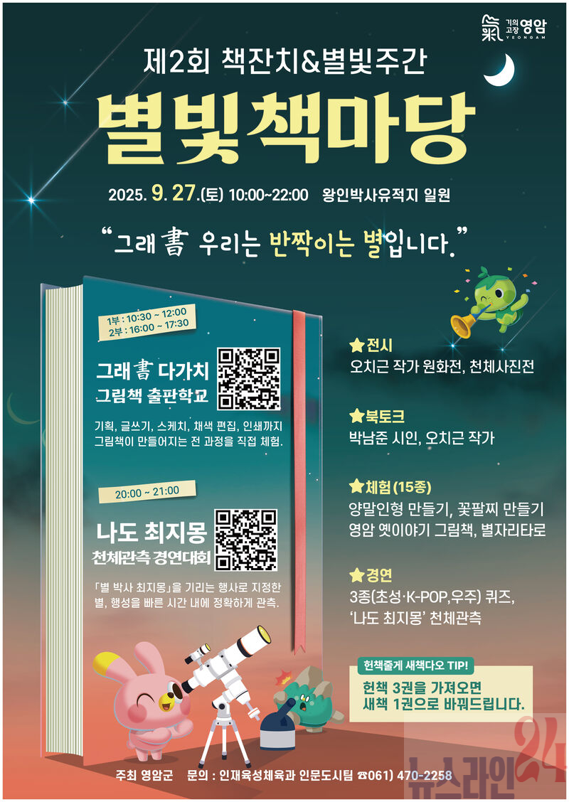 노재영 영암군 인재육성체육과장은 “별빛책마당은 영암군민과 관광객이 함께 어울리는 행사로, 책을 통해 새로운 경험을 나누는 기회가 될 것이다. 누구나 즐길 수 있는 다양한 프로그램에서 편안한 가을을 마음껏 누리길 바란다”고 전했다.