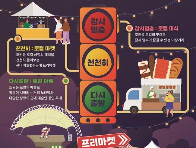 먼저 구는 오는 9월 27일 올해 첫선을 보이는 골목상권 축제들을 소개한다. 조원동 골목상권 일대에서 열리는 `제1회 대추초롱조원복길 골목상권 축제`는 `신호등`을 테마로 ▲상권 내 맛집 대표 먹거리를 만나볼 수 있는 `잠시멈춤`(로컬 미식존) ▲플리마켓, 체험 프로그램이 있는 `천천히`(로컬 마켓존) ▲거리노래방, 예술인 공연을 즐기는 `다시출발`(로컬 아트존) 등 모든 세대가 함께 즐길 수 있는 풍성한 콘텐츠를 선보인다.