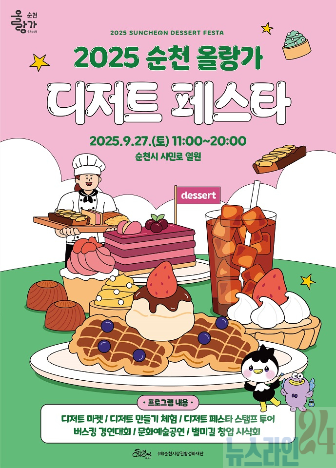 순천시(시장 노관규)는 오는 27일 오전 11시부터 오후 8시까지 시민로 일원에서 원도심 상권 활성화를 위한 특화 테마 축제 「2025 순천 올랑가 디저트 페스타」를 개최한다고 밝혔다.