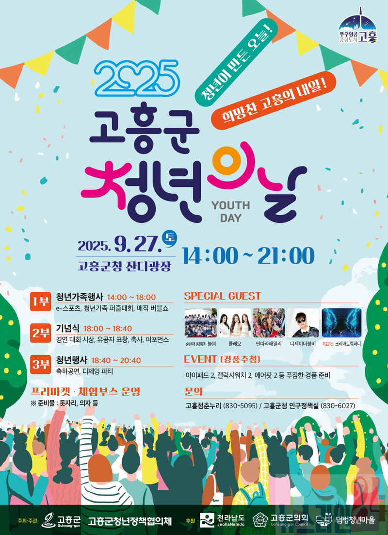 고흥군(군수 공영민)은 오는 9월 27일 고흥군청 잔디광장에서 ‘2025년 고흥군 청년의 날’ 행사를 개최한다고 밝혔다.