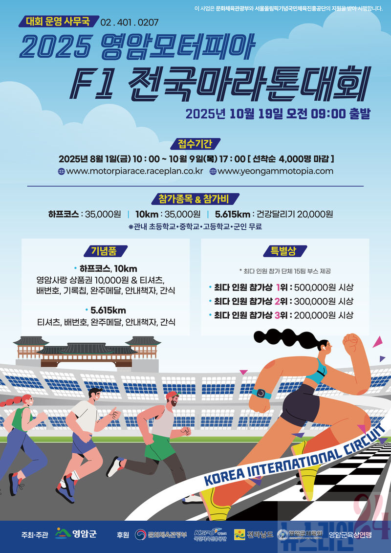 영암군(군수 우승희)이 10/9일까지 ‘영암모터피아 F1 전국 마라톤대회’ 참가자 4,000명을 선착순으로 접수받는다.