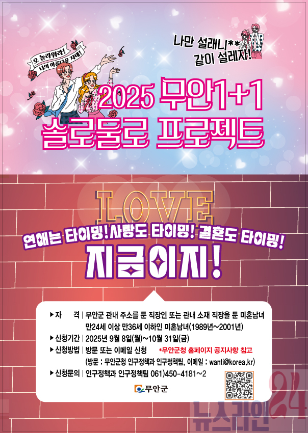 이번 솔로둘로 프로젝트 참가 대상은 무안군 거주 직장인 또는 군내 직장을 둔 미혼남녀(1989~2001년생, 만 24~36세)이며, 신청은 2025년 9월 8일부터 10월 31일까지, 방문 또는 이메일(wanti@korea.kr)로 신청할 수 있다. 자세한 사항은 무안군청 홈페이지 공지사항 또는 무안군 인구정책과 인구정책팀(☎ 061-450-4181)에서 확인할 수 있다.