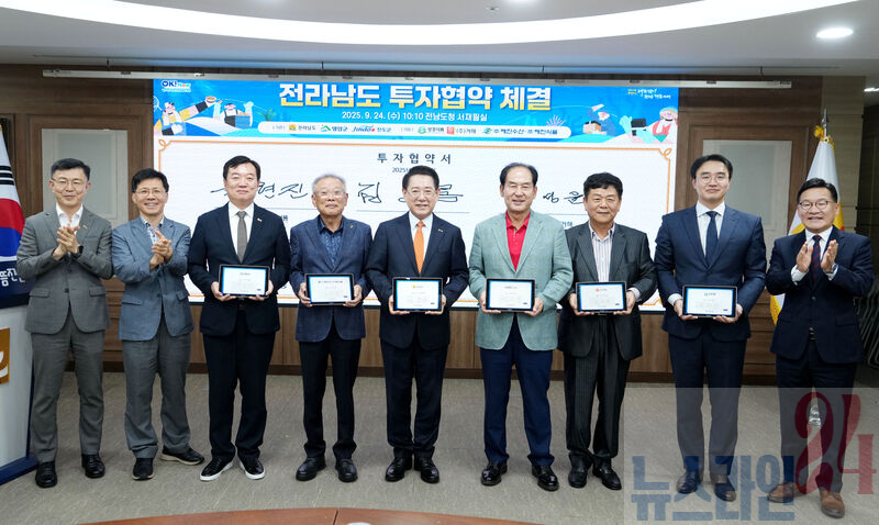 전라남도는 24일 도청 서재필실에서 ㈜성경식품, ㈜해진수산, ㈜해진식품 등 3개사와 투자금액 총 1천34억 원 규모의 투자협약을 했다고 밝혔다. 이번 투자로 302명의 신규 고용 창출도 기대된다.이날 협약식에는 김영록 전남도지사를 비롯해 육현진 ㈜성경식품 대표, 김성윤 ㈜거해 대표, 임한택 ㈜해진수산·㈜해진식품 대표, 김희수 진도군수, 윤재광 영암부군수 등이 참석했다.