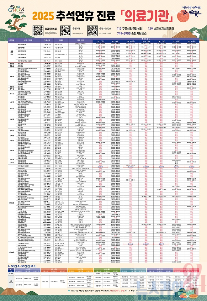 연휴 중 문을 여는 병·의원 및 약국 정보는 순천시·순천시보건소 누리집, 응급의료포털 E-gen에서 확인 가능하며, 인터넷 사용이 어려운 경우에는 보건소 응급진료 상황실(061-749-6905)로 문의하면 된다.