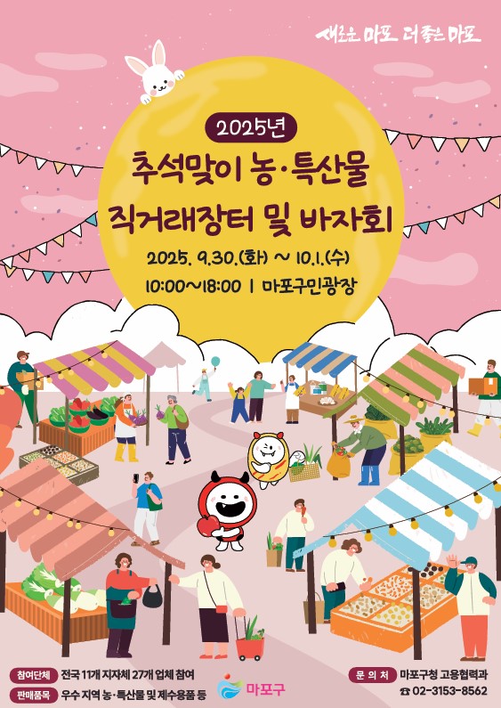 마포구(구청장 박강수)는 9월 30일부터 10월 1일까지 마포구민광장에서 ‘2025년 추석맞이 농·특산물 직거래장터 및 바자회’를 개최한다.
