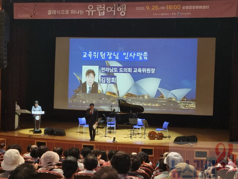 김정희 전라남도의회 교육위원장은 9월 25일(금), 순천건강문화센터에서 열린 ‘클래식으로 떠나는 유럽 예술 여행’ 행사에서 축사를 통해 청소년과 시민들에게 따뜻한 격려와 희망의 메시지를 전했다.