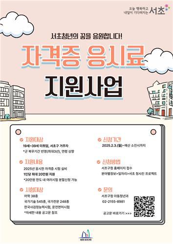 서울 서초구(구청장 전성수)는 취업을 준비하는 청년들을 위해 `청년 자격증 응시료 지원사업`을 신설해 이달 3일부터 신청자 접수를 시작한다.