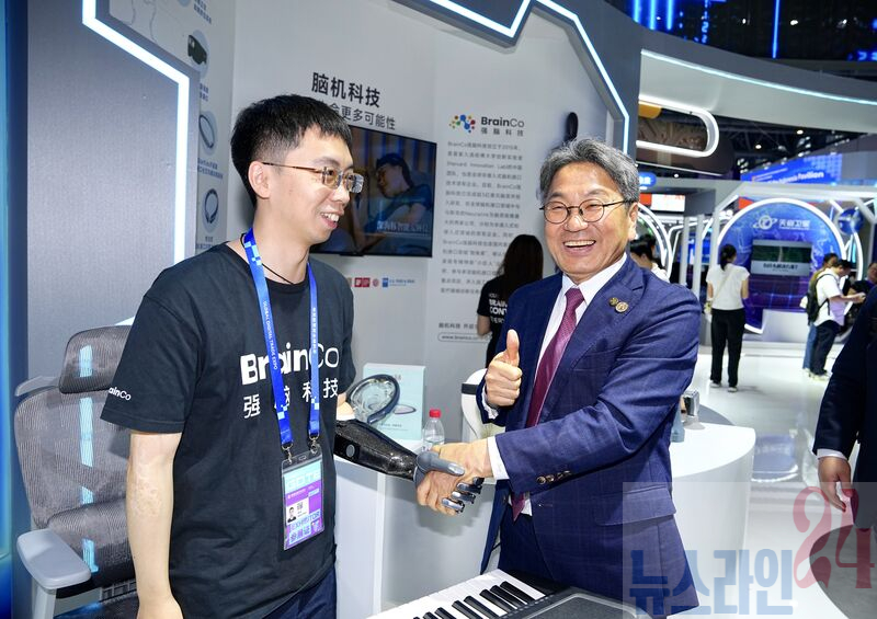 강기정 광주광역시장이 25일(현지시간) 오후 중국 항저우 그랜드컨벤션센터에서 열린 ‘제4회 항저우 디지털 무역 박람회’에서 중국 ‘육소룡’ 중 하나인 뇌-컴퓨터 인터페이스 기업 ‘브레인코’ 부스를 찾아 스마트 의족·의수를 착용한 직원들과 함께 기술에 대해 논의하고 있다.