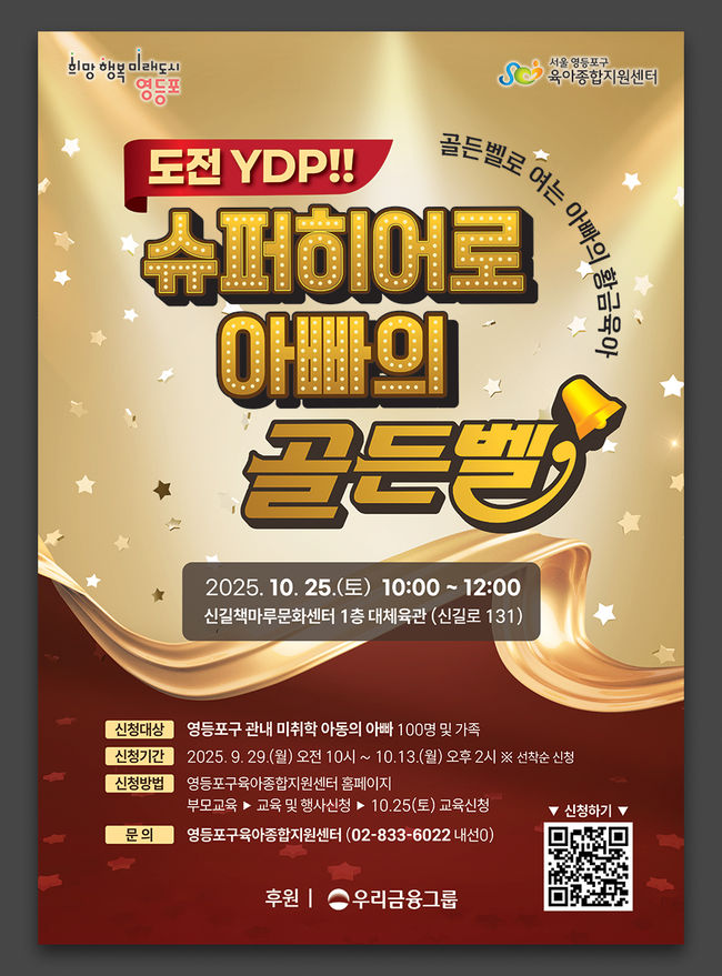이번 대회는 2025년 10월 25일(토) 신길 책마루 문화센터 1층 체육관에서 열린다. 영등포구에 거주하는 0세부터 7세까지 미취학 자녀를 둔 아빠 100명을 대상으로 하며, 참가 신청은 9월 29일부터 영등포구 육아종합지원센터 누리집에서 선착순으로 접수받는다. 입상자에게는 소정의 상품이 제공된다.
