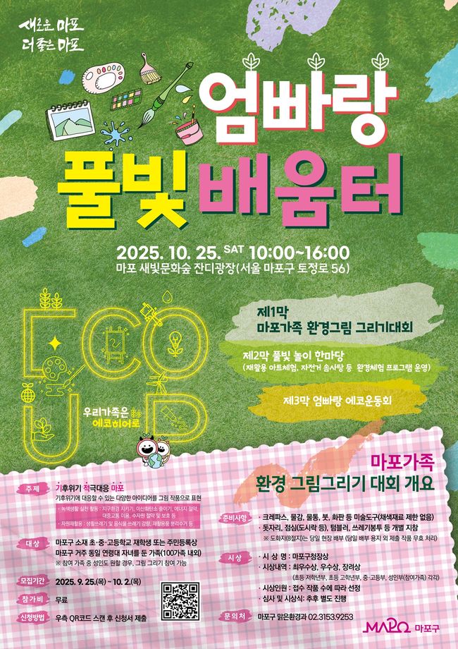 프로그램은 ▲제1막 ‘마포가족 환경 그림 그리기 대회’ ▲제2막 ‘풀빛놀이 한마당’ ▲제3막 ‘엄빠랑 에코운동회’로 나눠 진행된다.