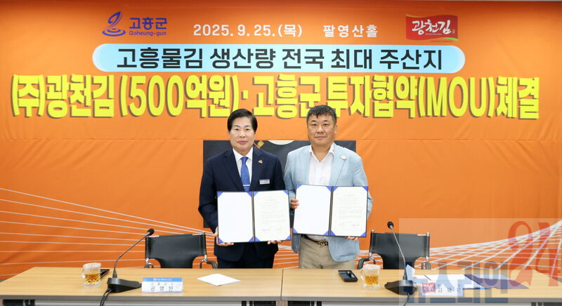 고흥군(군수 공영민)은 지난 25일 군청 팔영산홀에서 국내 김 산업 선도기업인 ㈜광천김(대표 김재유)과 500억 원 규모의 민간개발 투자협약(MOU)을 체결했다고 밝혔다.