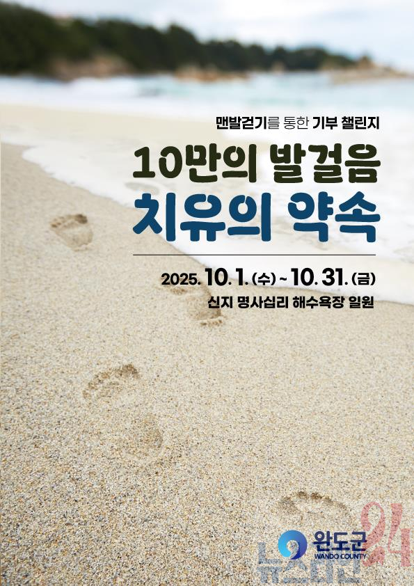 완도군은 해양치유센터 이용객 10만 명과 해양기후·문화, 맨발 걷기 등 누적 치유객 50만 명 달성을 기념해 10월 1일부터 31일까지 한 달간 신지 명사십리 해수욕장 일원에서 ‘해양치유 맨발 걷기 나눔 챌린지’를 진행한다.